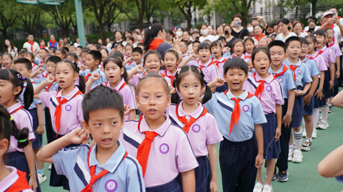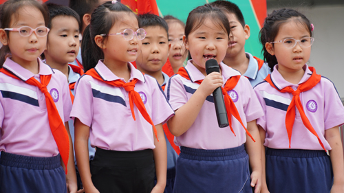 随后,全体队员齐声朗诵《光荣入队》,用朗朗童声表达对组织生活的向往与对未来的信心。“准备着,为共产主义事业而奋斗!”——“时刻准备着!”在大队辅导员的领呼下,全体队员的回应铿锵有力,展现了新时代少先队员的精神风貌。仪式在庄重的退旗曲中圆满结束。